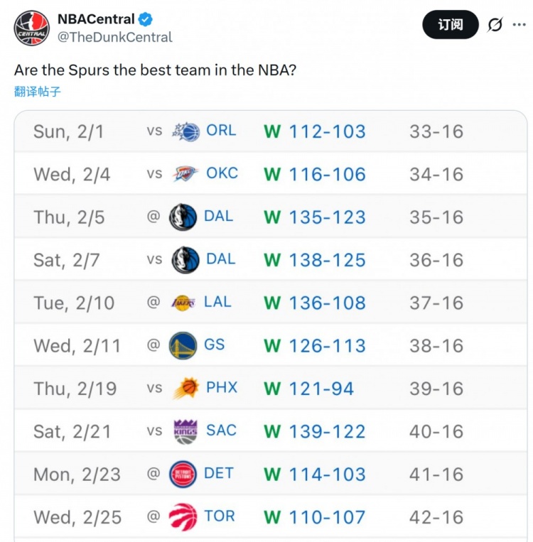 赛后美媒NBA Central晒出马刺最近十场战绩,并发问:“马刺是联盟最强球队吗?”