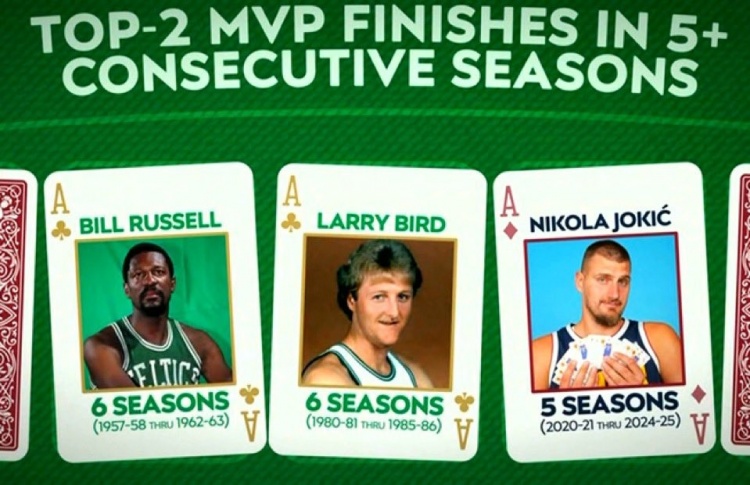 约基奇:20-21赛季至24-25赛季(连续5个赛季)