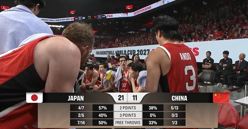 首节比赛,中国男篮全队16中5,其中三分3中0,罚球3中1。