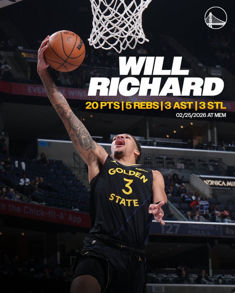 勇士官方晒出理查德海报,理查德成为自2012年4月16日的克莱·汤普森之后,首位打出这一数据的勇士新秀?。