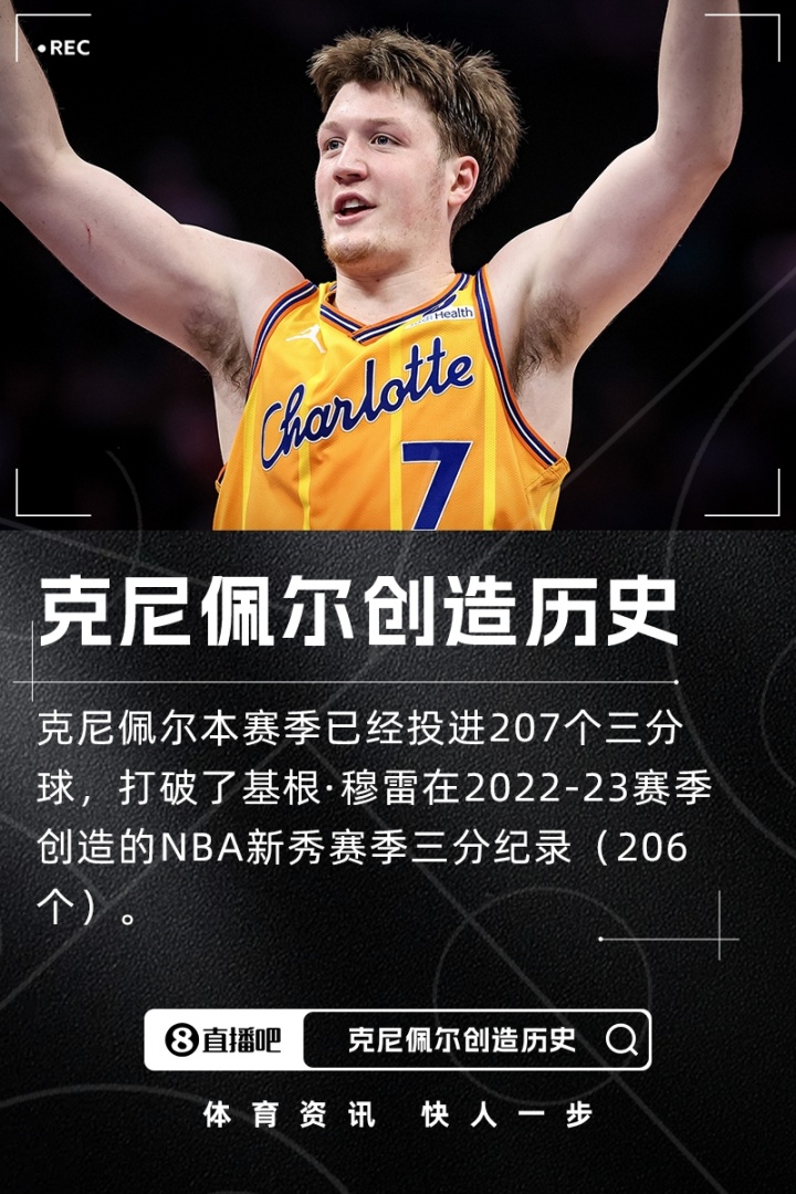第三节末段,克尼佩尔轰进了自己本赛季的第207个三分球,打破了2022-23赛季的基根·穆雷保持的NBA历史新秀赛季三分命中纪录(206)!