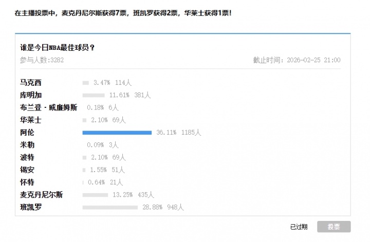 结果显示,综合吧友、主播投票情况,麦克丹尼尔斯当选今日NBA最佳球员!