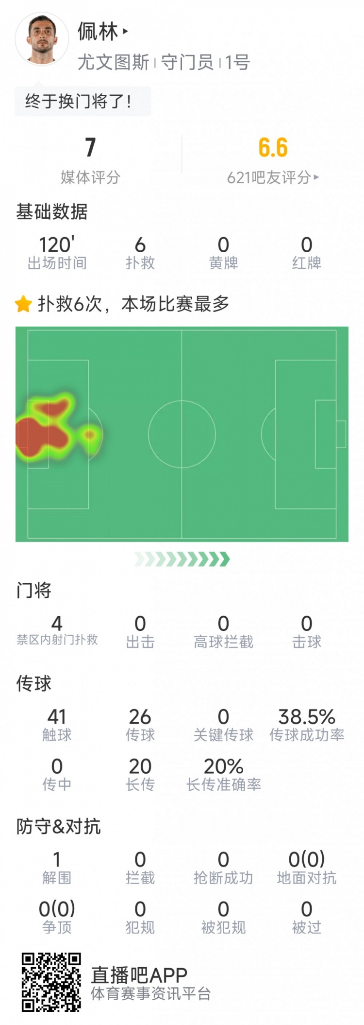 本场比赛尤文门将佩林获得首发机会,他在本场贡献6次成功扑救,41次触球,传球成功率39%,1次解围,赛后获评7分。