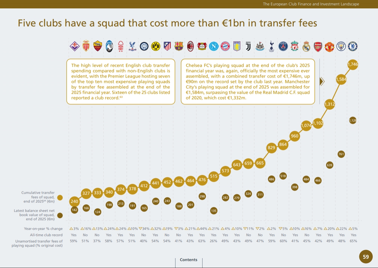 02月26日讯 欧足联官方发布了《2025俱乐部财务与投资格局报告》,其中对各支球队阵容的组建成本进行了统计,并列出了排名前25的球队。切尔西高居第一,现有阵容所花费的转会费达到了17.46亿欧元。三只英超球队曼城、曼联、阿森纳紧随其后。