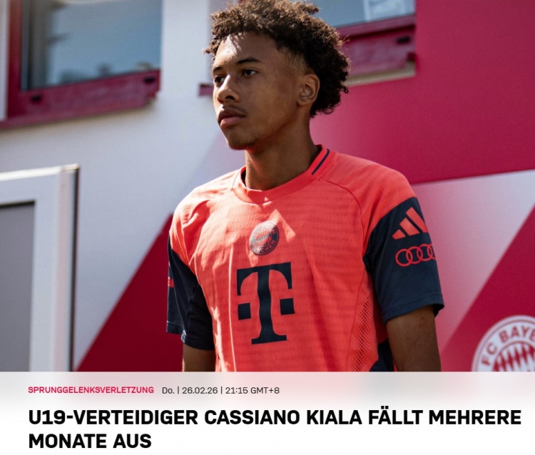 2月26日讯 拜仁官方宣布U19中卫基亚拉(Cassiano Kiala)脚踝受伤,将缺阵数月。这名17岁小将在代表德国U17国家队参加阿尔加夫杯时受伤,并已成功接受手术。