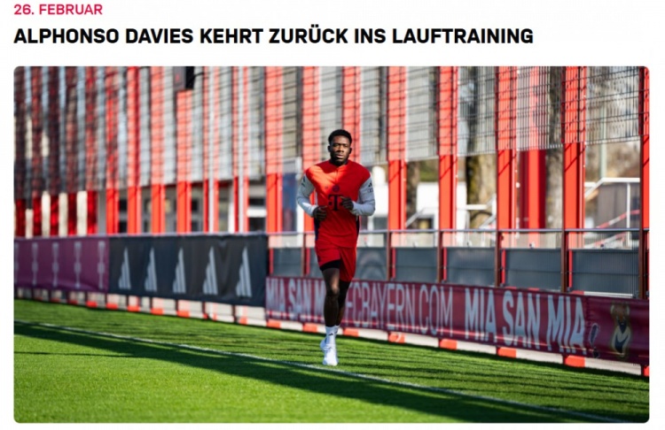 2月26日讯 拜仁官网发文,确认边后卫阿方索·戴维斯恢复跑步训练。