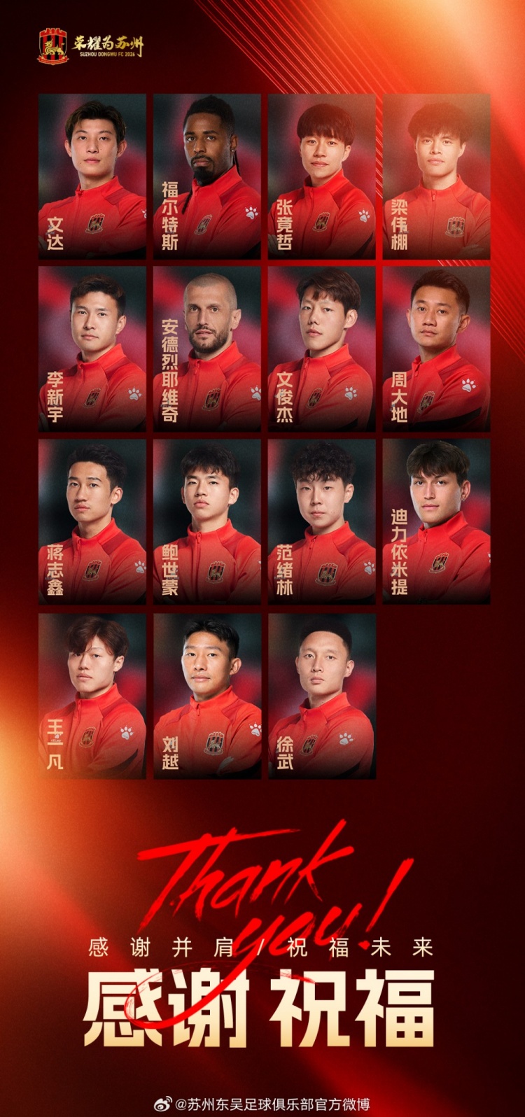 经友好协商,球员文达、福尔特斯、张竟哲、梁伟棚、李新宇、安德烈耶维奇、文俊杰、周大地与苏州东吴足球俱乐部合同到期,正式离队。