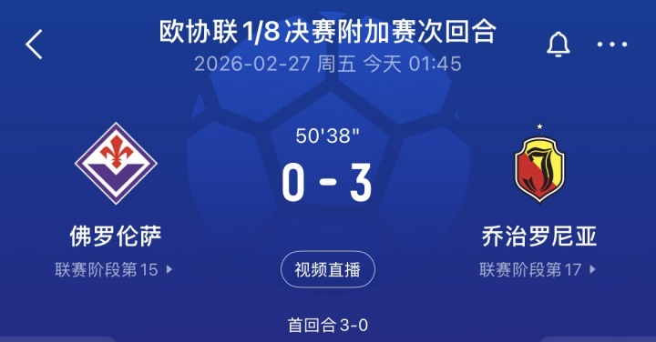 02月27日讯 欧协联1/8决赛附加赛次回合,佛罗伦萨对阵乔治罗尼亚。